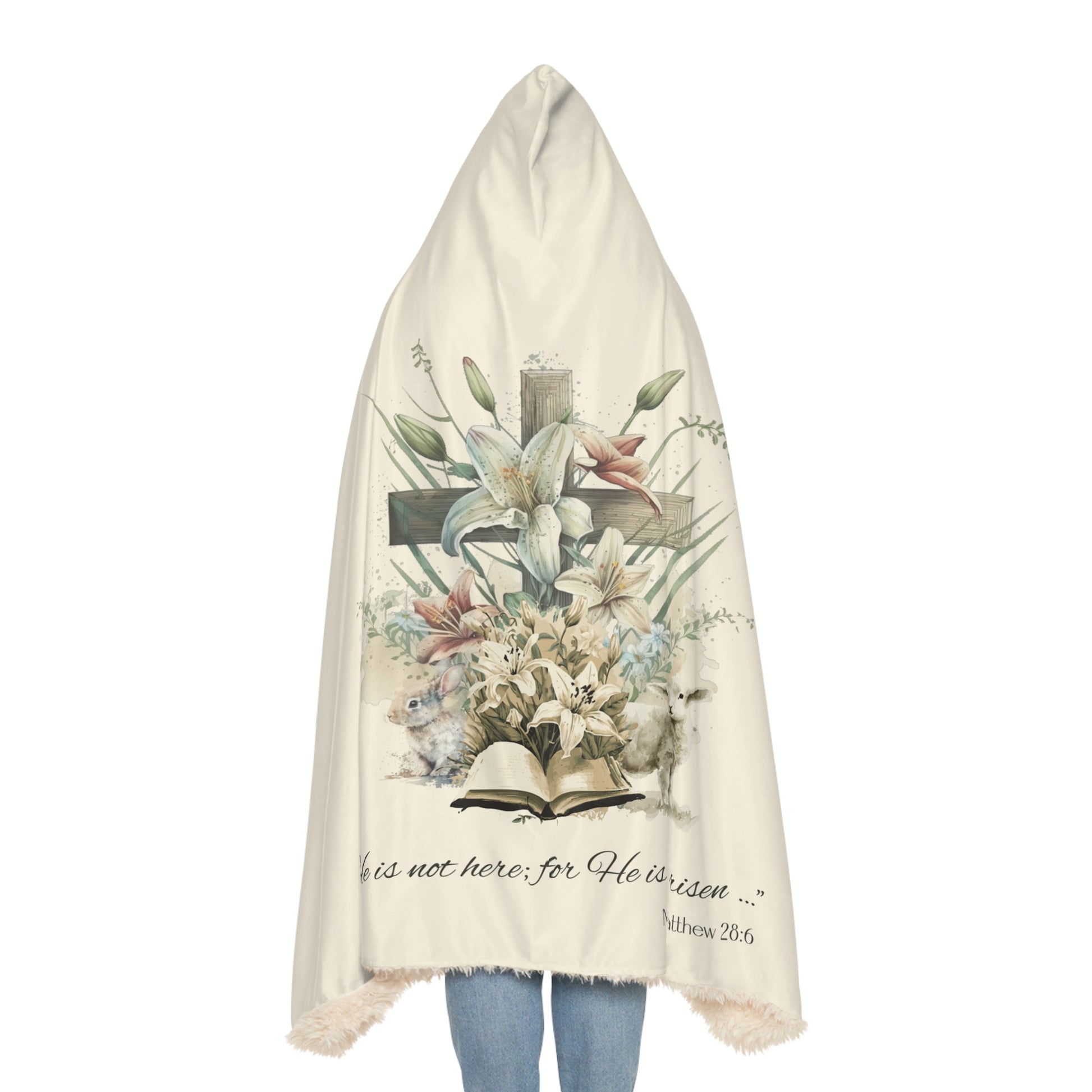 Wrap yourself in the message of hope and renewal with this plush sherpa hooded blanket inspired by Matthew 28:6. With its soft fleece exterior and fluffy sherpa lining inside, this blanket combines comfort with faith, reminding you of the victory and joy of the Resurrection.